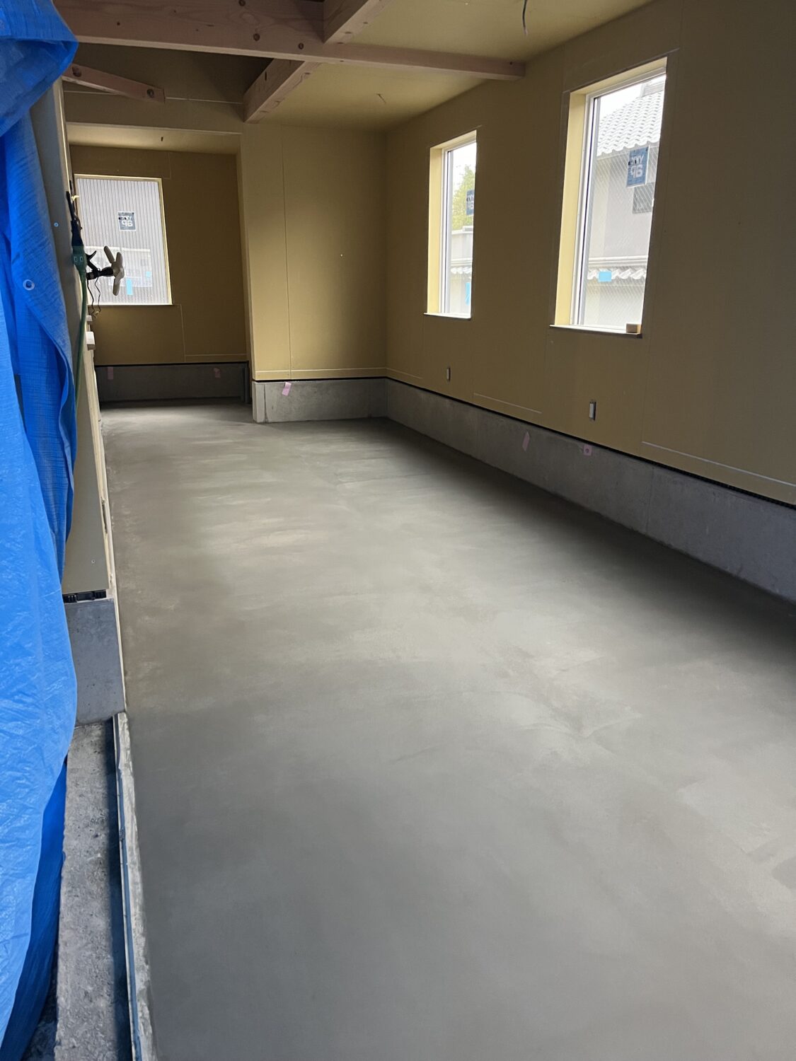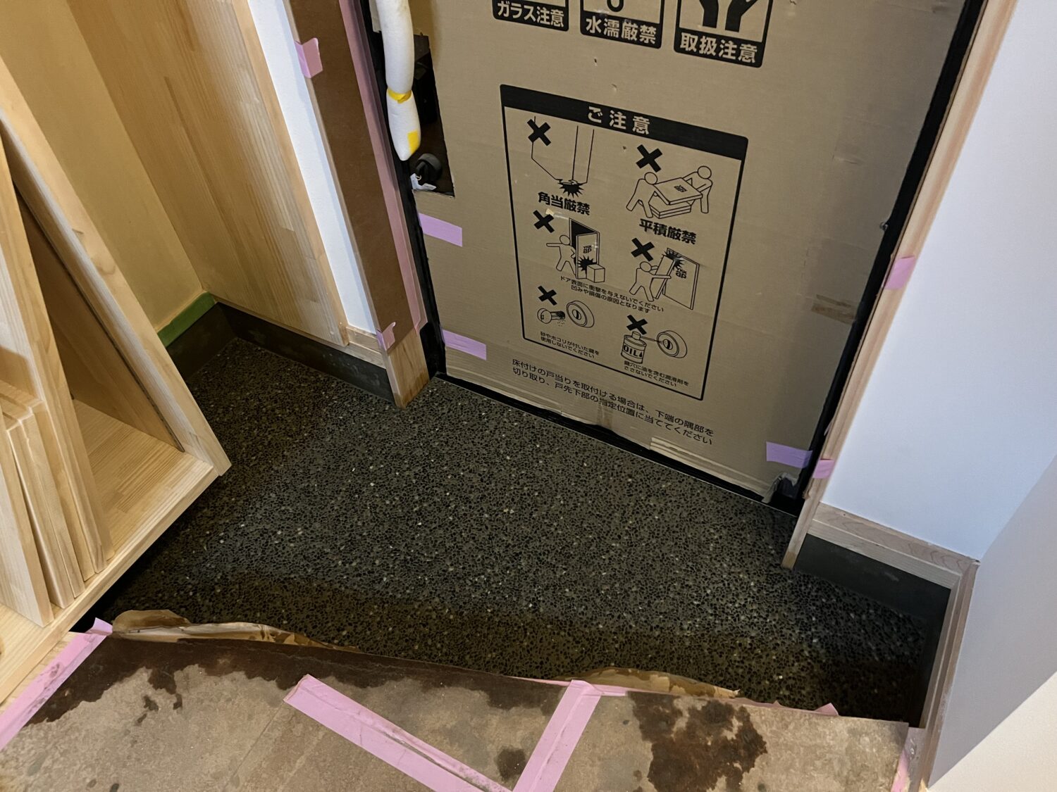 玄関土間及び階段の工事に入っております。今回は洗い出し仕上げとなり、黒をメインとした小石を使用しています。