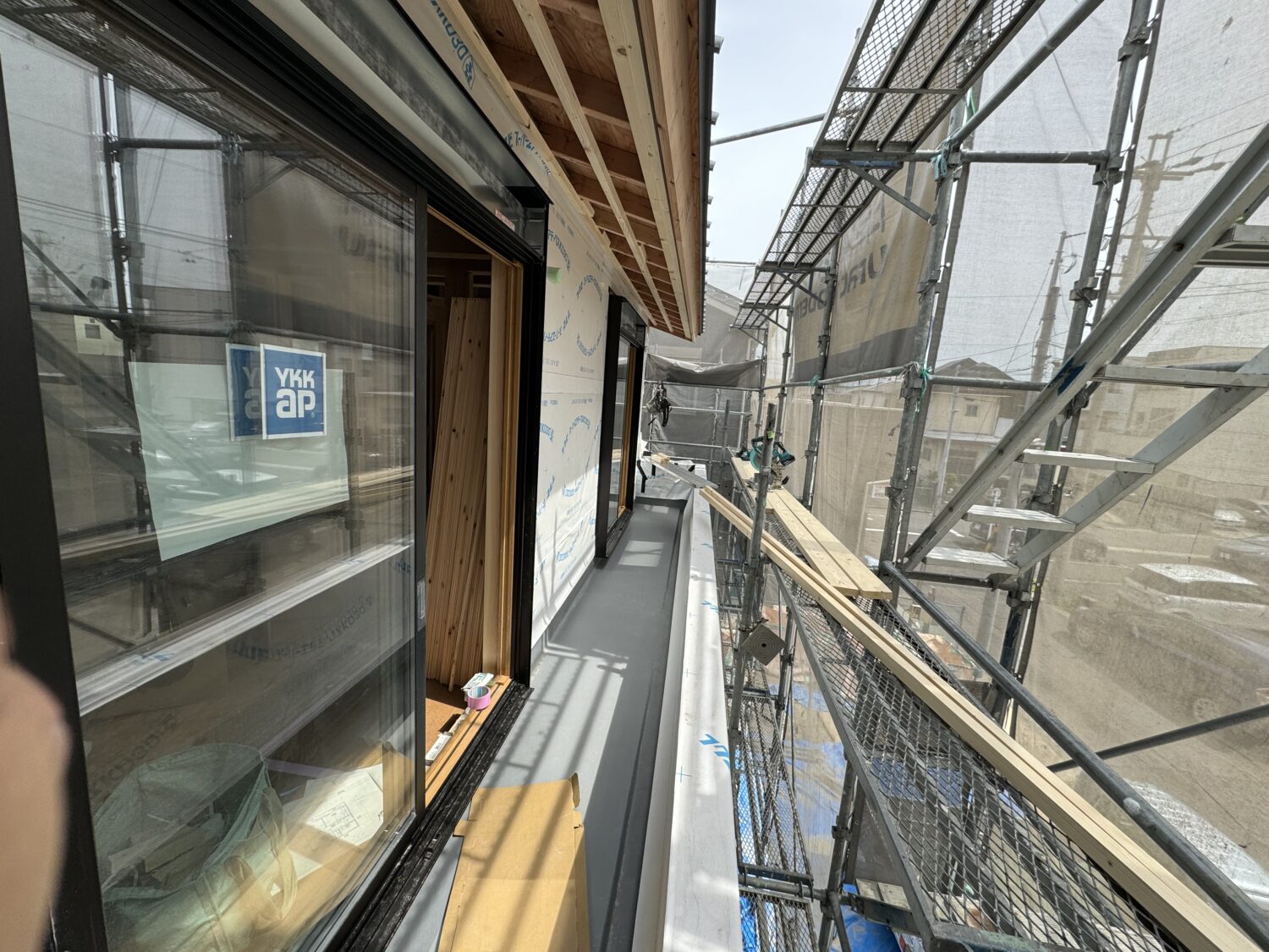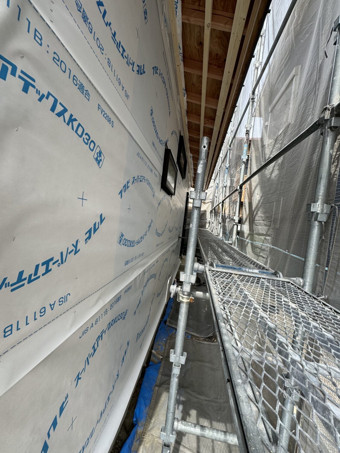 外壁面に透湿防水シートを張りました。外部からの雨の侵入を防ぐ為の大切な作業です。また、サッシ廻りや開口部廻りなどの防水を施し外壁下地検査を行います。
