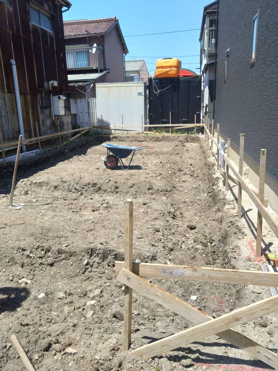 先日、地盤補強工事を終え、今日から基礎工事に入りました。