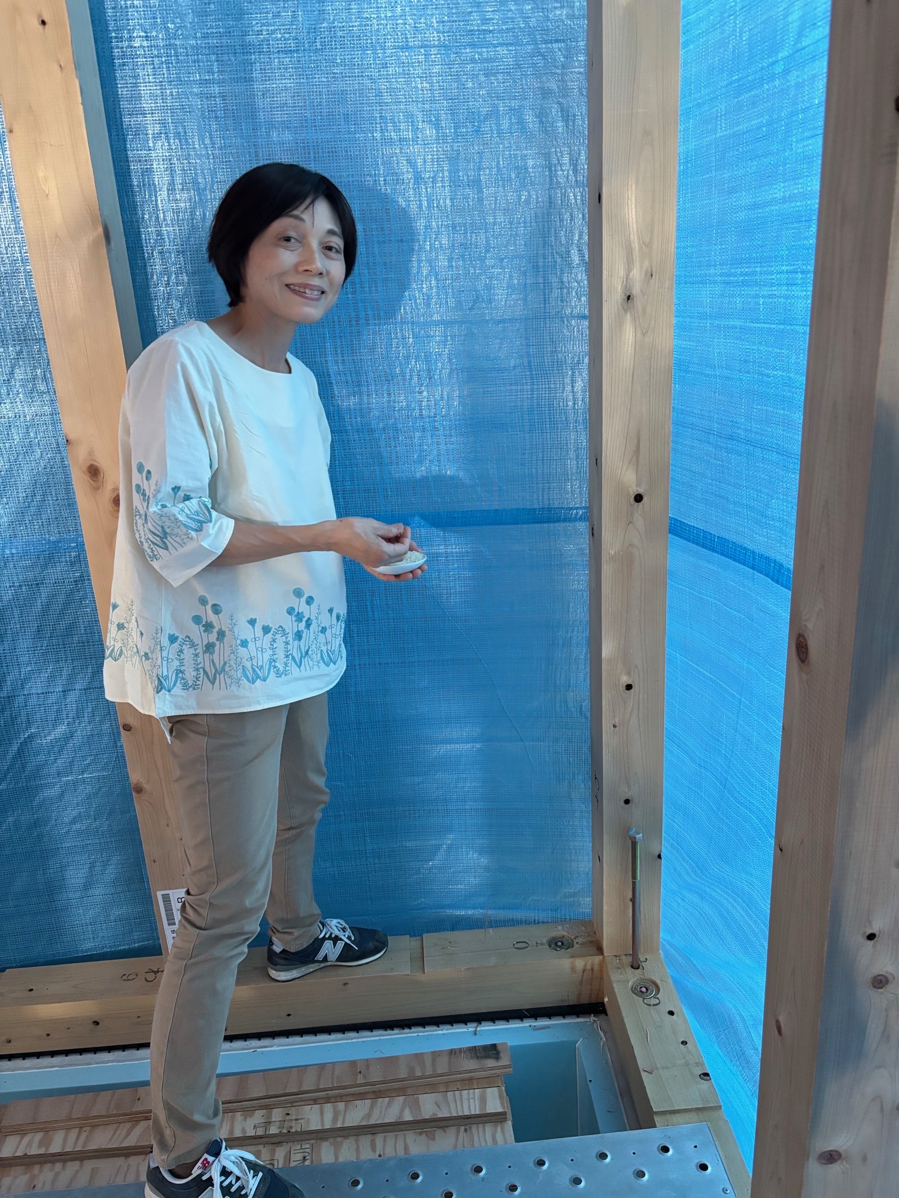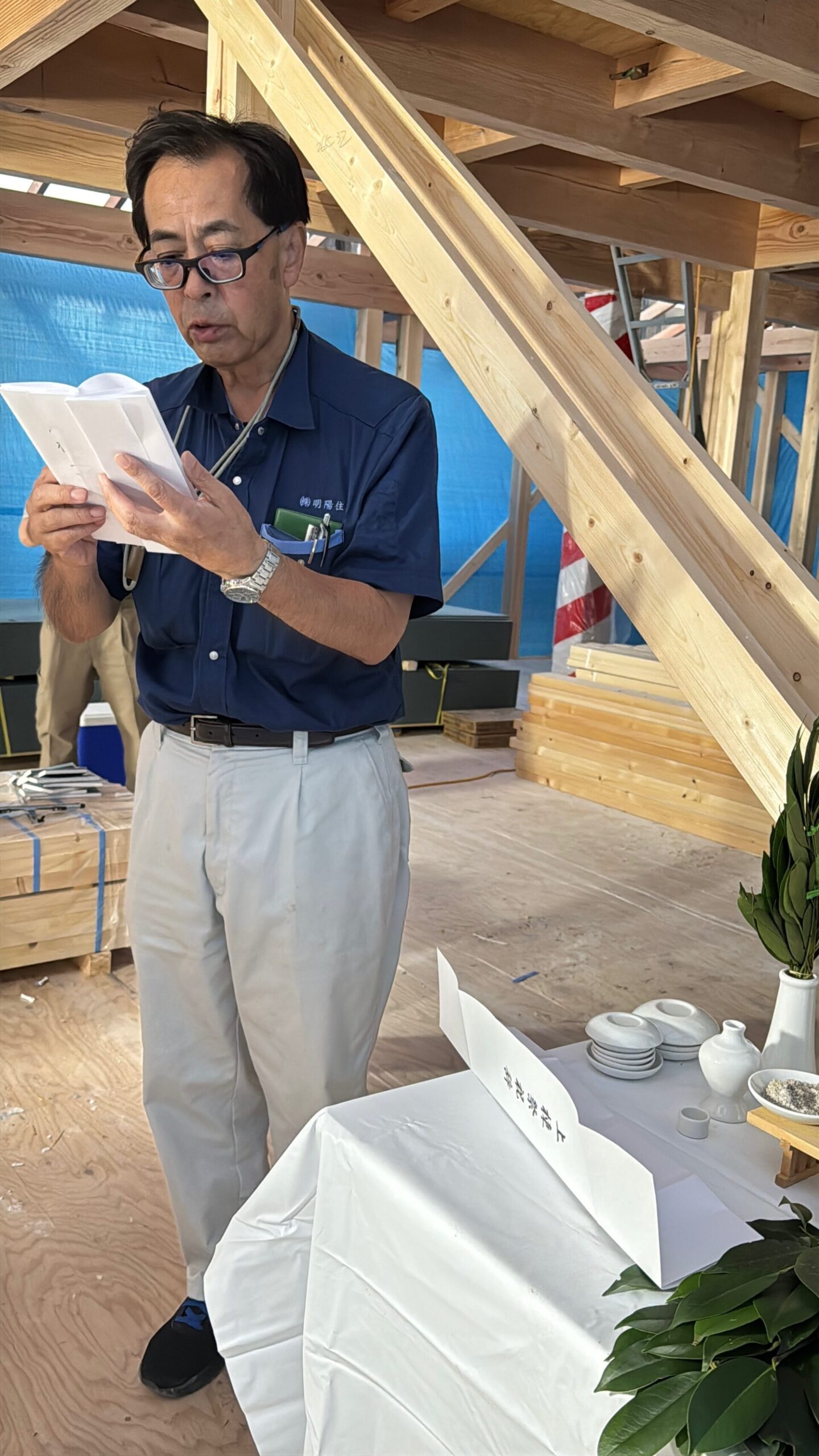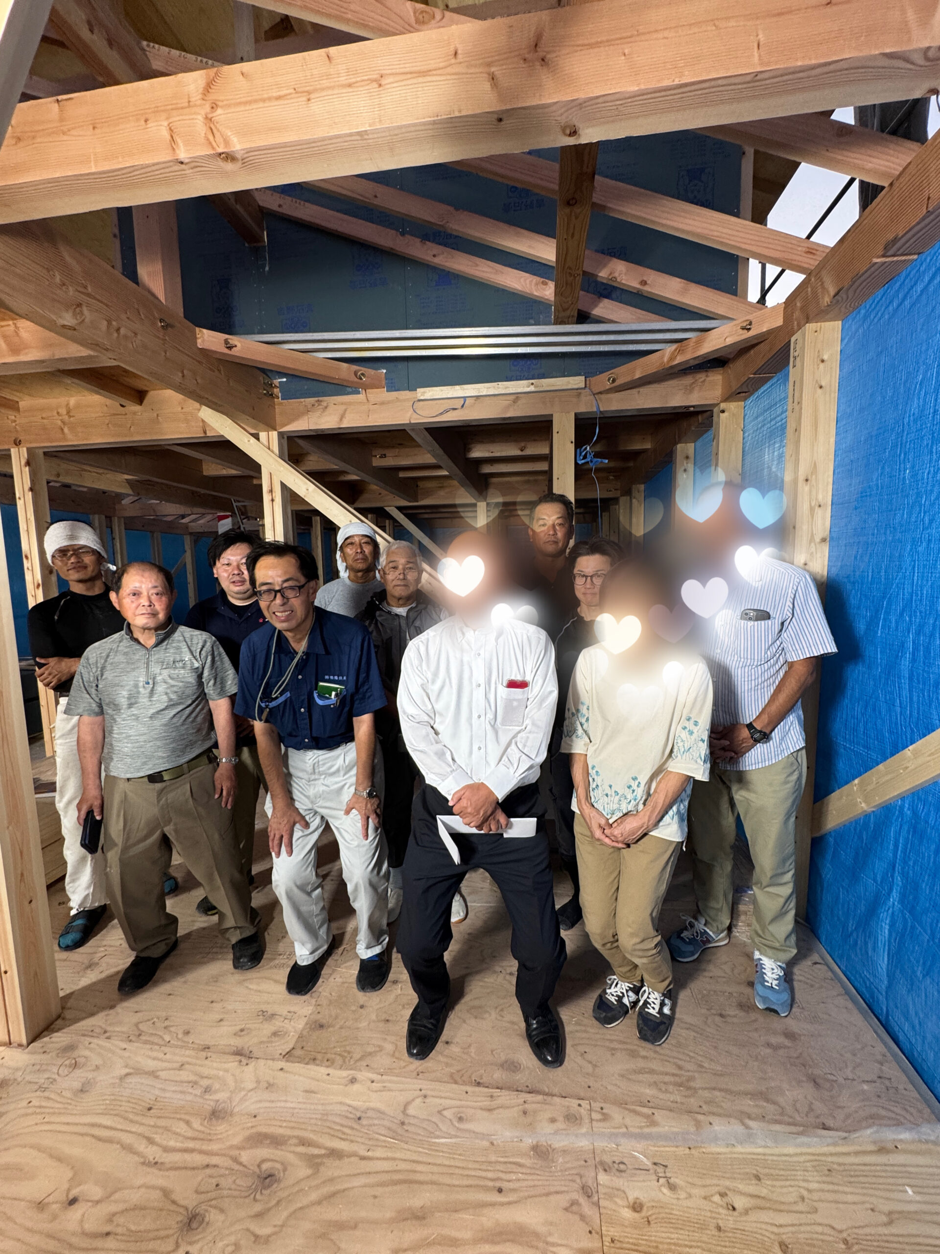 今日、上棟工事を終えて社長・山西さん・レッカーさんと写真を撮りました。また、お客様、棟梁共に上棟祭を行いました。四隅を清めて回り、玉串を捧げ工事の安全を祈念いたしました。本日は誠におめでとうございます。