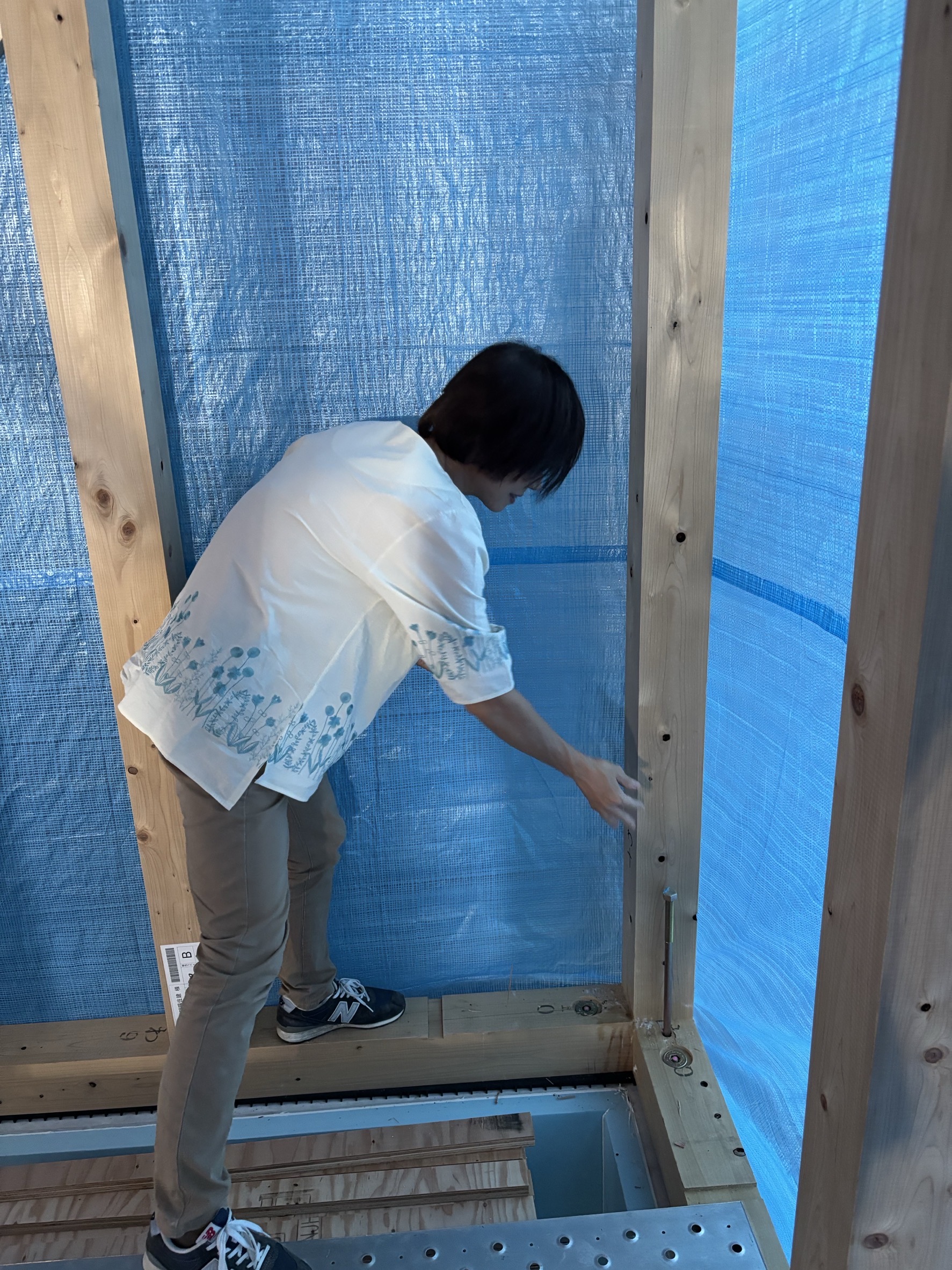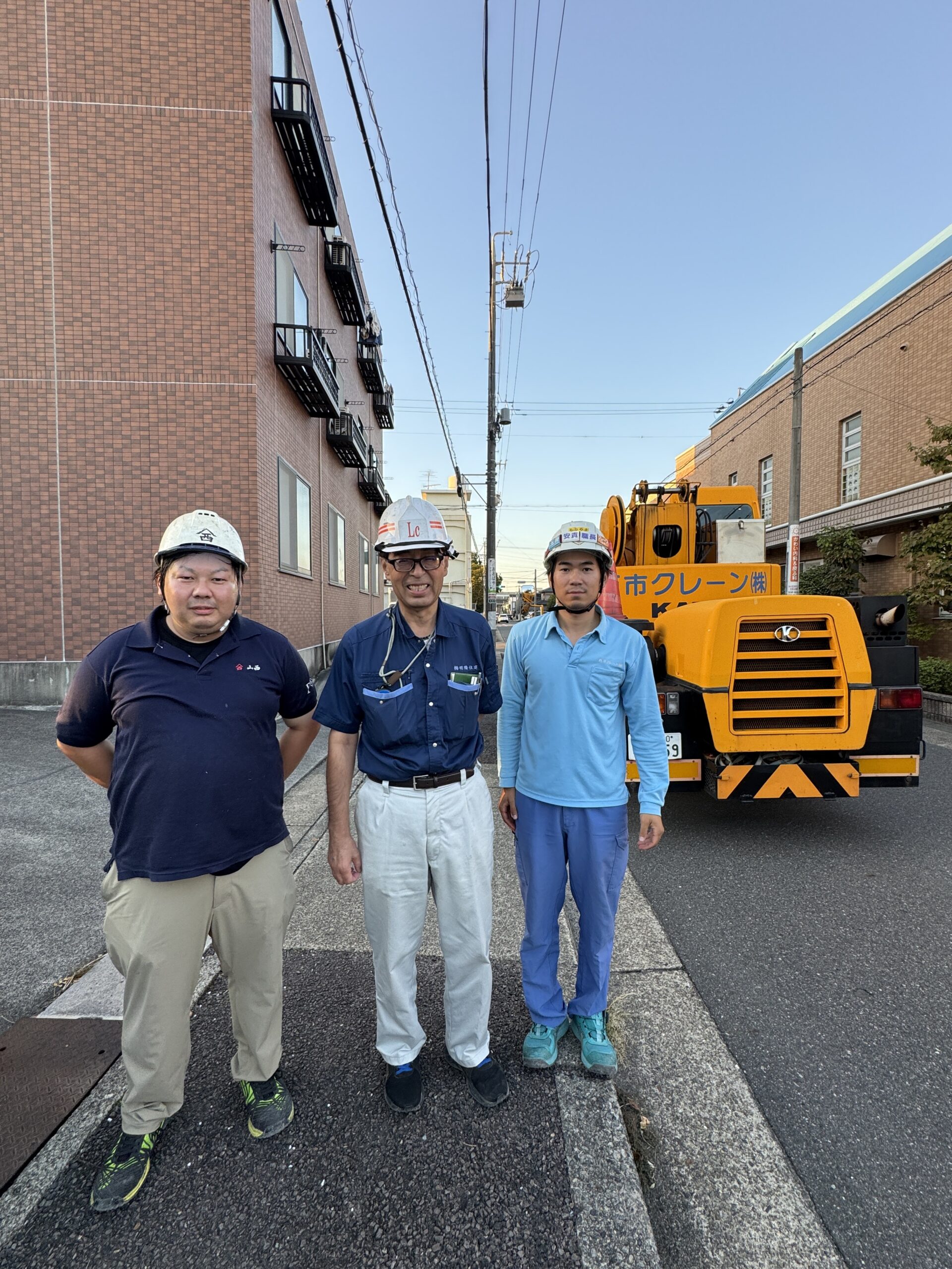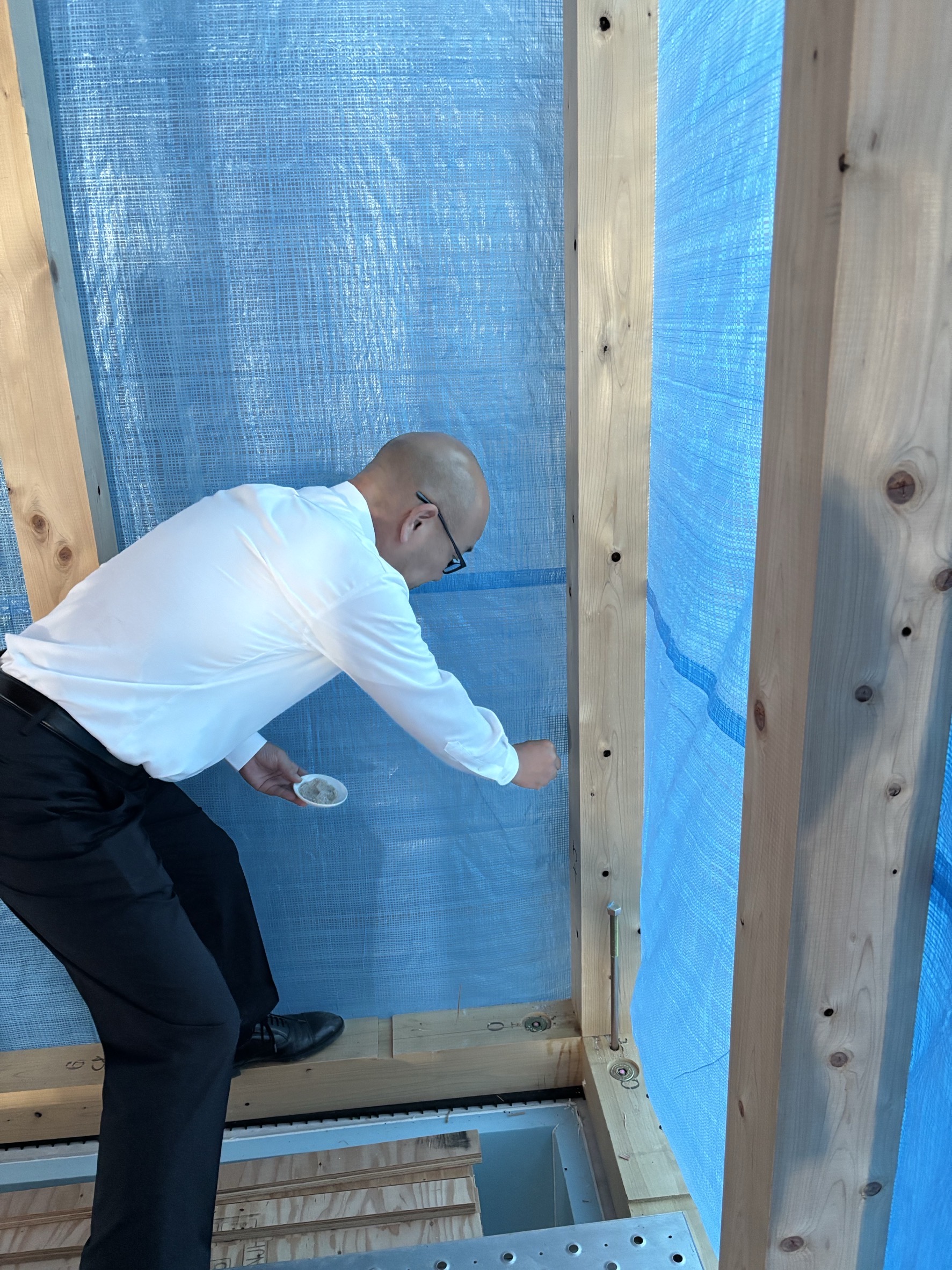 今日、上棟工事を終えて社長・山西さん・レッカーさんと写真を撮りました。また、お客様、棟梁共に上棟祭を行いました。四隅を清めて回り、玉串を捧げ工事の安全を祈念いたしました。本日は誠におめでとうございます。