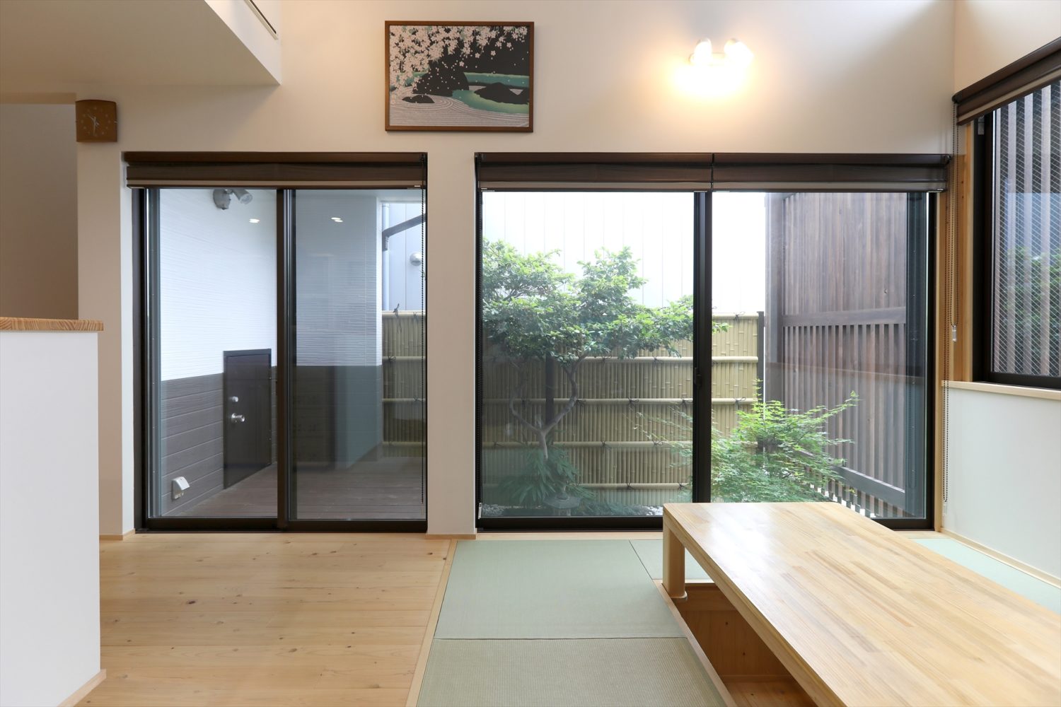 窓の先にもう一つ部屋があるような感覚が起こり広く感じさせることができます。その他、地窓を使い低い位置で視線を逃がすと、小さな坪庭でも植栽を印象付けることで屋外を感じ、広がりを覚えさせることができます。