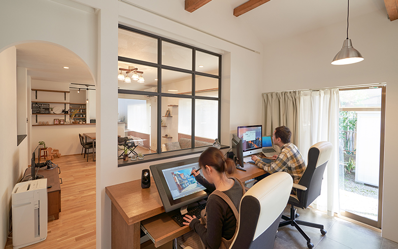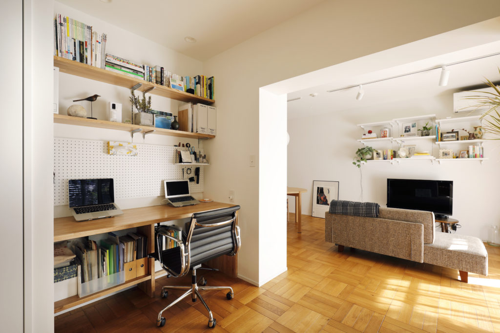 自宅のワークスペースだと、集中力や緊張感に欠け、プライベートと仕事の切り替えが難しいといった声も聞かれます。モチベーションや作業効率を上げたいなら、最初に、仕事場らしい環境づくりをするとよいでしょう。デスクや書棚は、生活感のある家具などが目に入りにくい向きに配置します。広さはそれほど重要ではなく、必要なものが必要なときにすぐ手に取れるくらいのスペースが仕事の効率を上げてくれます。壁面や頭上を活用して収納を設置すると、デスク上はスッキリ保たれ仕事に取りかかりやすいはずです。自然光が入る位置なら明るい雰囲気でリラックスしたまま集中できるでしょう。