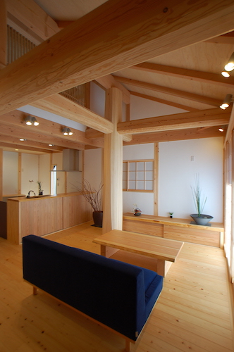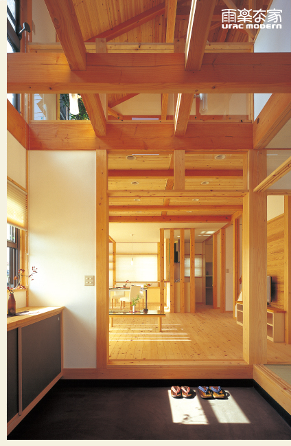 我が家でゆったりくつろぐ時間、見上げる先にはどんな風景を想像しますか?木造軸組の構造体である梁組みを見せることの多い「雨楽な家」では、たくましい梁が掛かる吹き抜けの上に杉板張りの勾配天井というような風景が見られます。