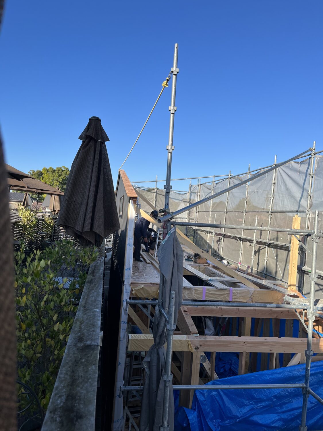 押し壁工法とは...完全に外側の壁を完成させてから壁を押して建てていく工法です。隣地に建物が建っており