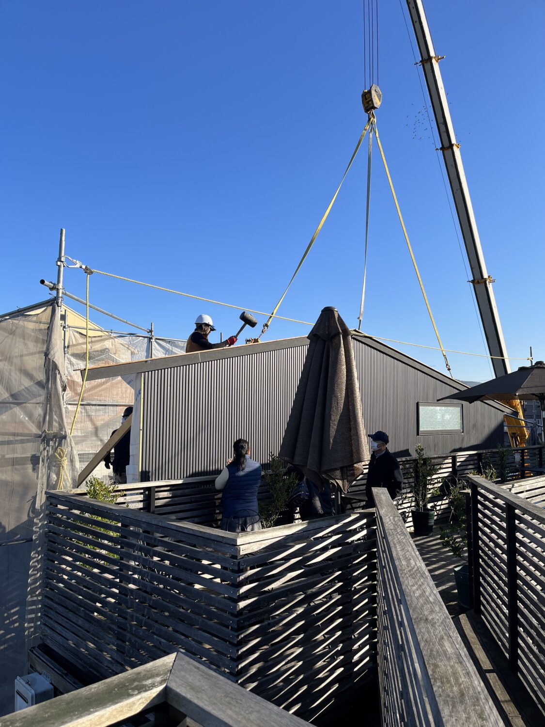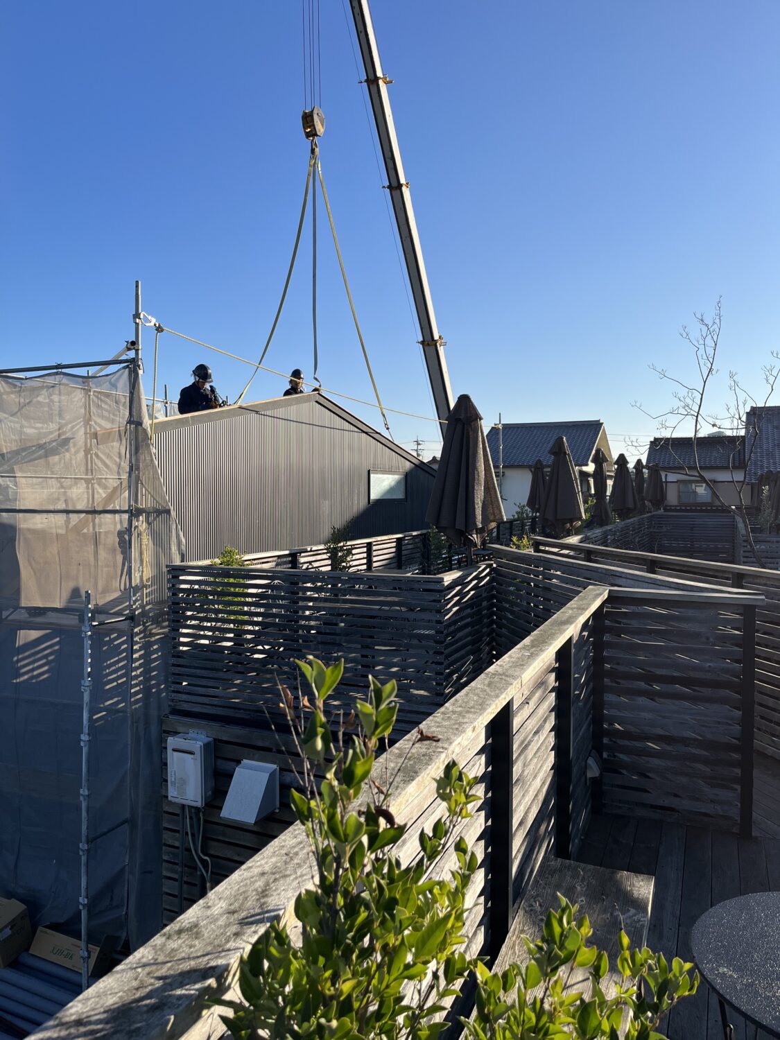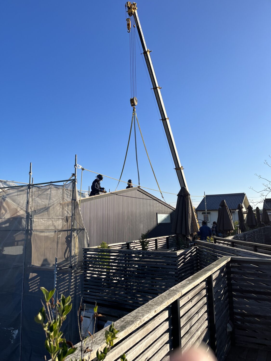 かつ隙間が狭いと後から工事ができないため先にすべての工事を終わらせておいてから上棟します。柱、梁が組み終わったら、サッシを取り付け、石膏ボード、透湿防水シート、外壁下地、外壁工事まで完成させて、完成した壁を立てておきます。後は、上棟時に完成させた壁をレッカーで吊って組み立てていきます。