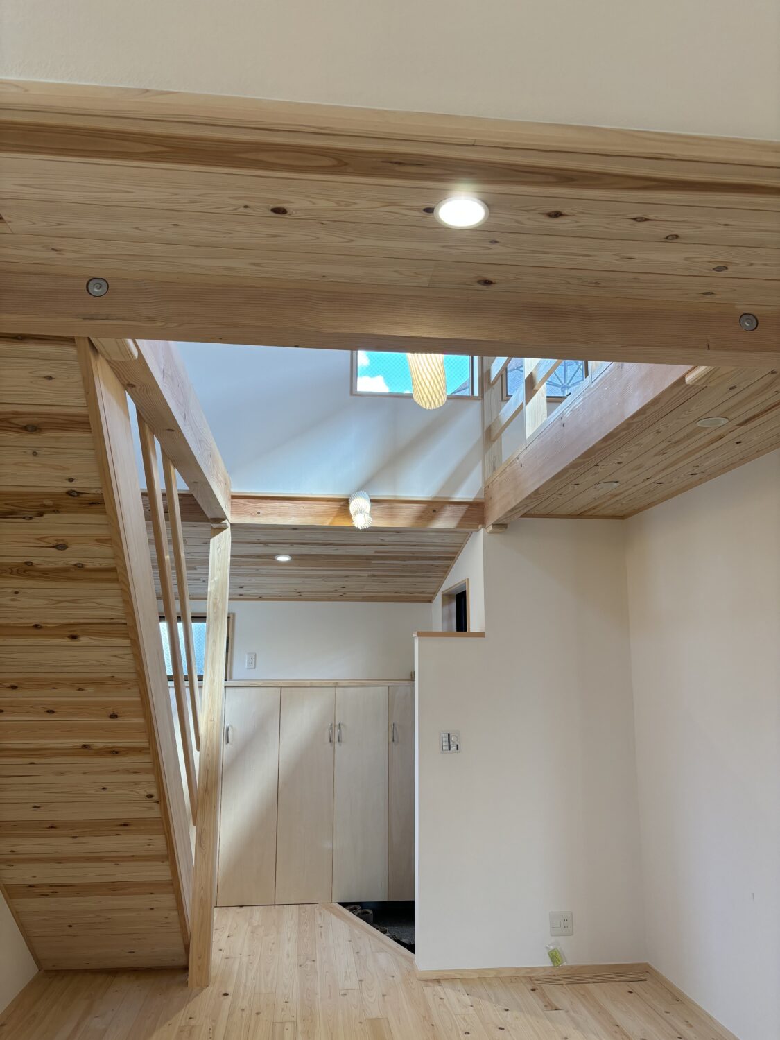 癒しの空間、リビングの開放感を求めて、「押し壁工法」で建てられる会社を求めて巡り合った木の家。玄関土間に入ると2階の勾配天井まで見わたせる吹き抜けで開放的なリビング。吹き抜けは2階の窓からも陽の光を呼び込みます。ホタテ貝殻が原料の「ルナしっくい」がつくるきれいな空気と、無垢の桧の香りに包まれて深呼吸をすれば、心身共にリラックス。是非ご体感いただきたい癒しの空間です。