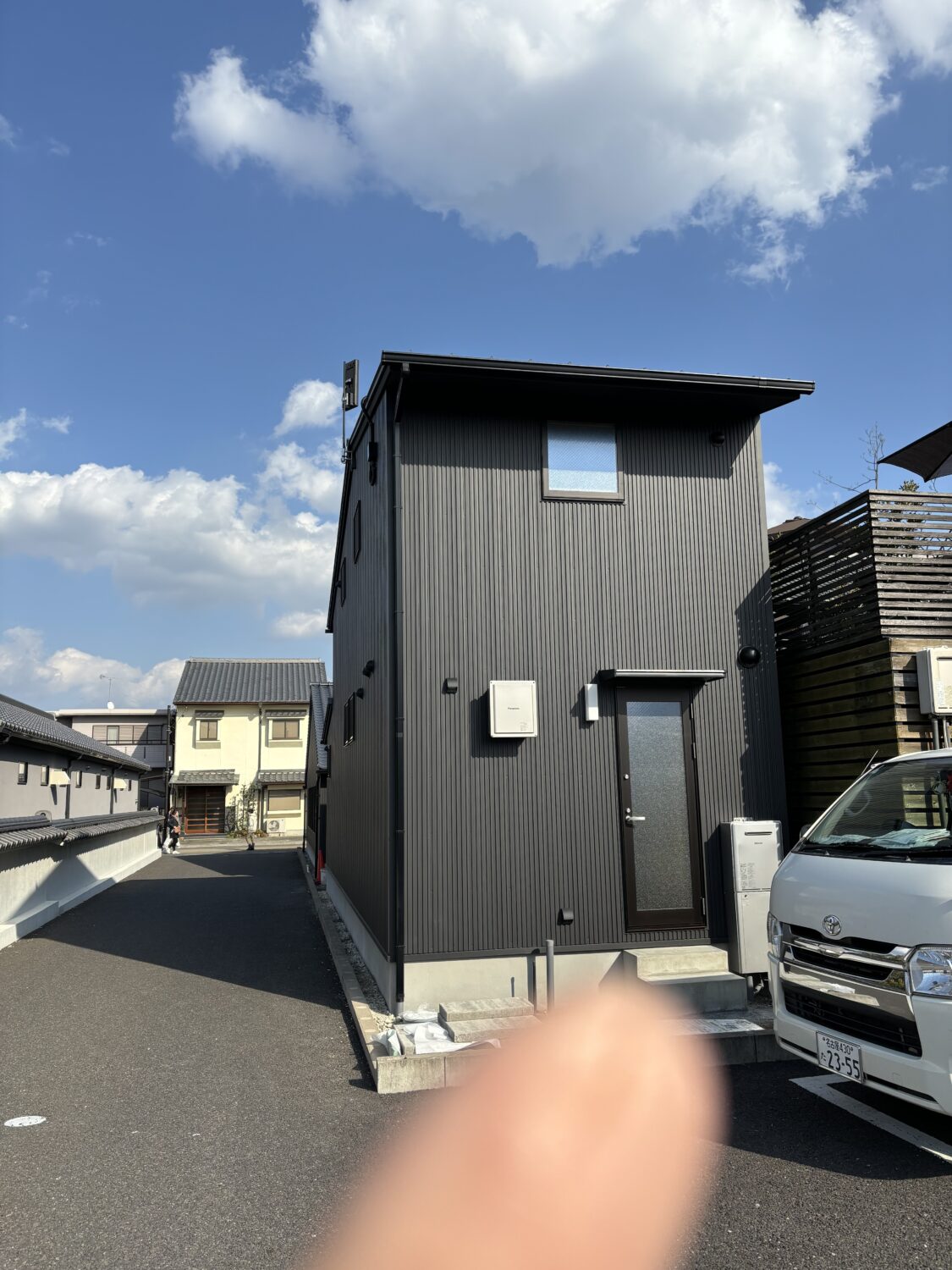 隣の敷地まで13cm、足場を立てる隙間がなくても木の家を建てることができます。先に柱、梁、外壁まで仕上げた壁を押して建てる「押し壁工法」で、壁を隣地境界線まで近づけて、敷地を最大限活かして建てた実例をご覧ください。