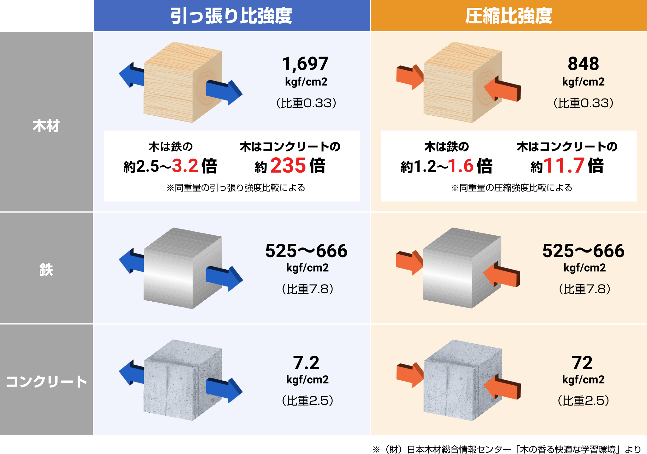 鉄の4倍以上の引っ張り強度、コンクリートの5倍以上の圧縮強度を持っています。このように、木は引いたり押したりする力にバランスよく抵抗する力を持っています。