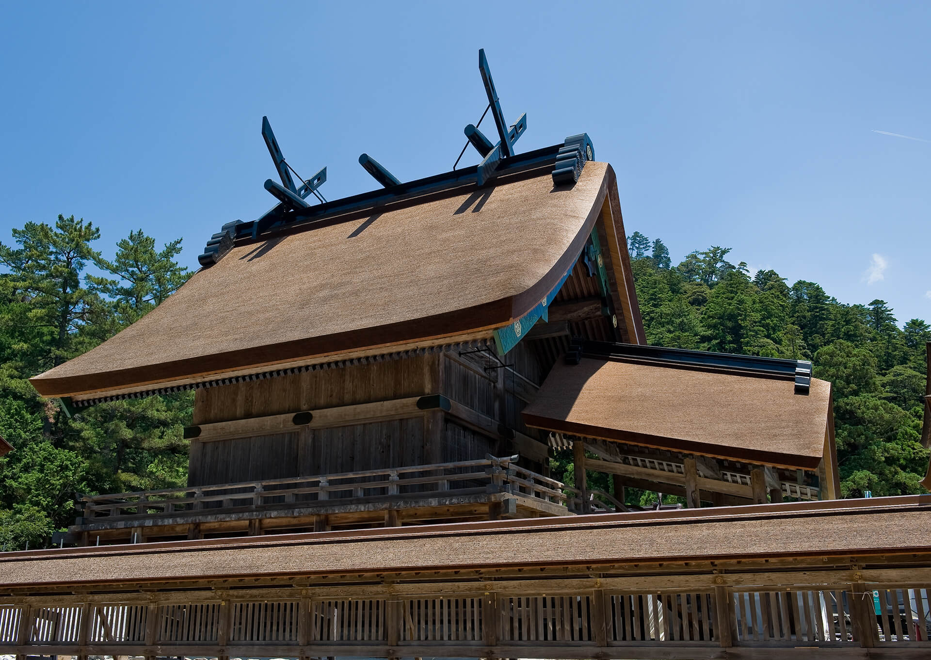 出雲大社の本殿は、日本最古の建築様式のひとつである「大社造」です。切妻屋根、妻入り、高床式という非常に特徴的な形をしています。見た目はシンプルですが、その佇まいには圧倒的な力強さがあります。