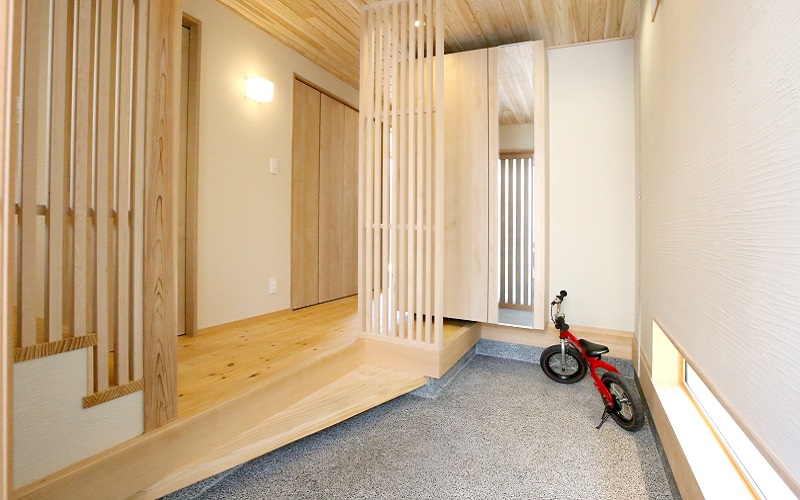 部屋の扉や玄関戸は引き戸がおすすめです。高齢者にとって開き戸の開け閉めは体の前後移動が大きいため負担になることも。引き戸であれば、前後移動もなく、歩行を介助することになったり車いすでもスムーズに通過できます。新築時は開き戸にする場合も、将来引き戸にもできるような間取りにすると安心です。